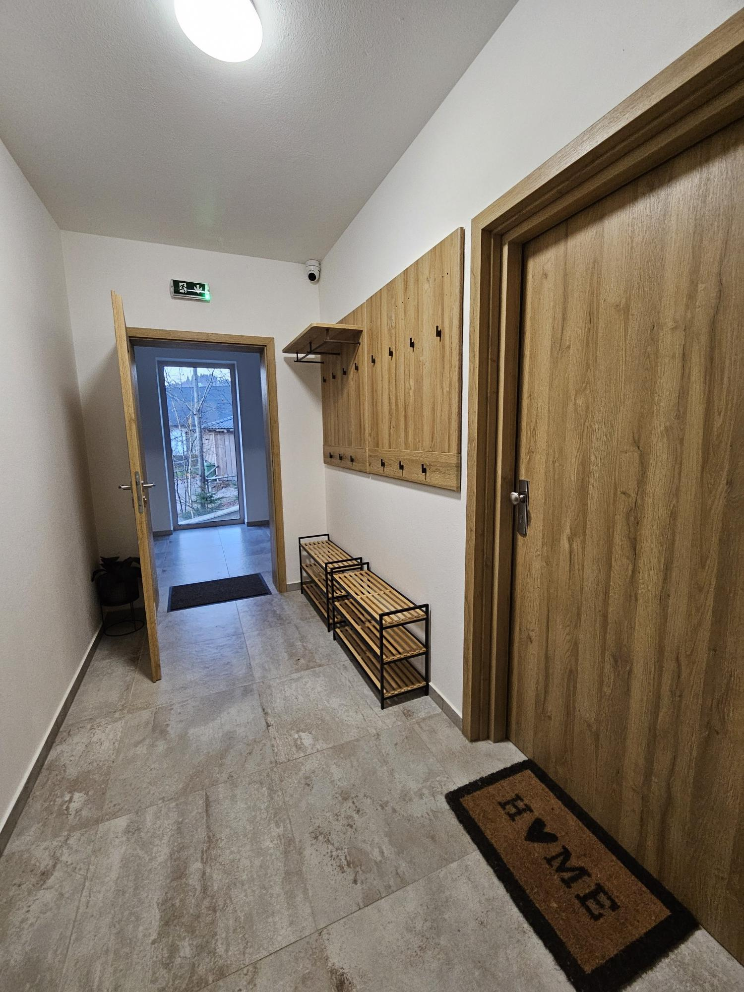 Vstupné dvere + oblôžkové interiérové dvere, podlaha ukončená betónovým poterom s keramickou dlažbou(laminát, drevo), povrchové úpravy stien- vápenno-cementové omietky, interiérový náter 2x biela farba